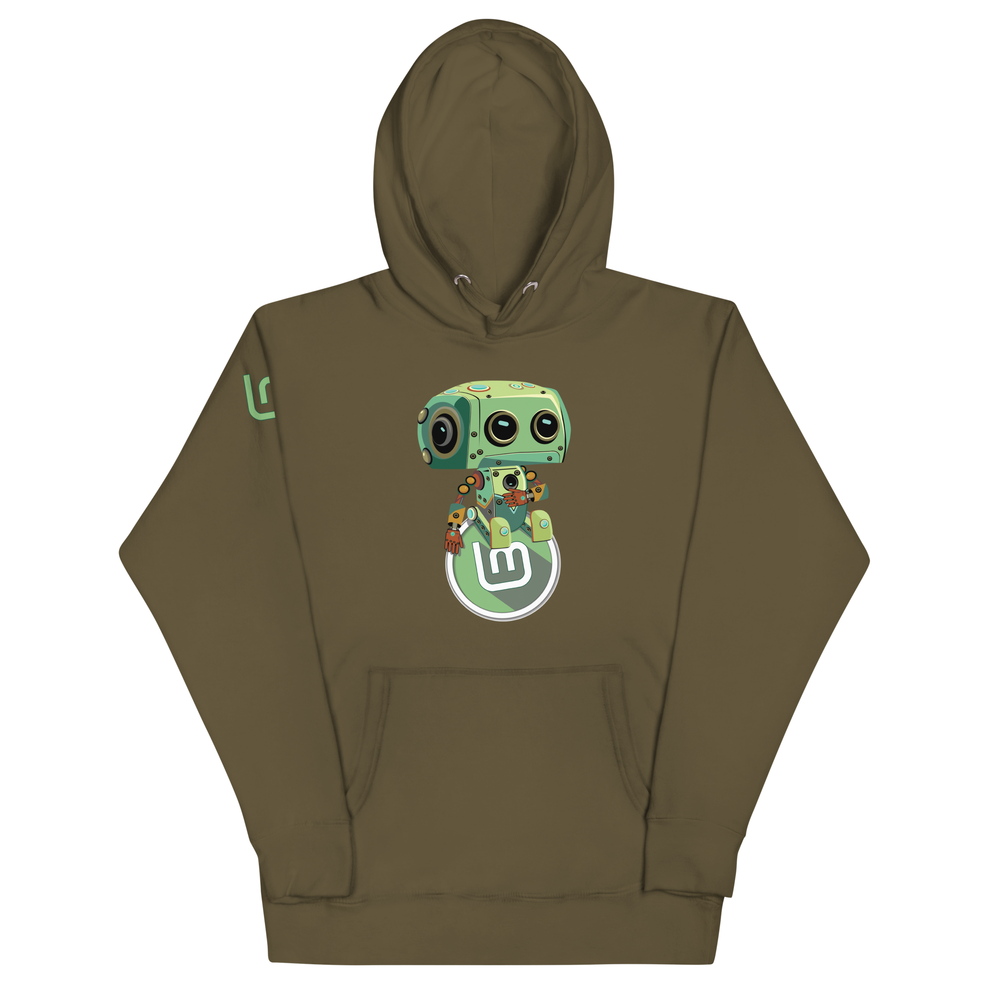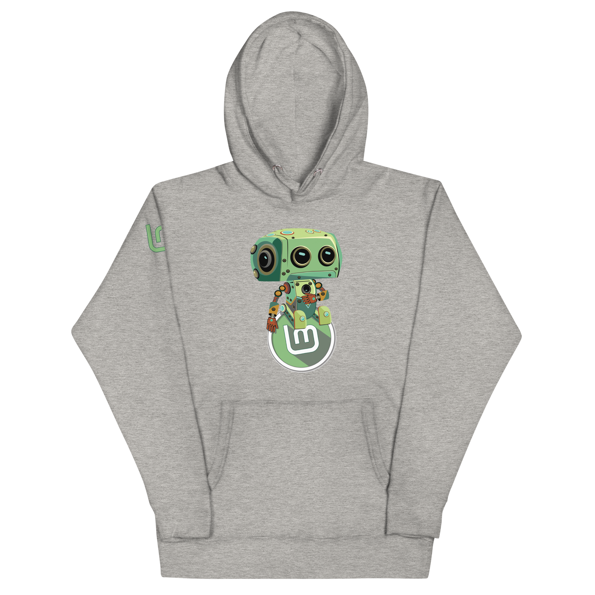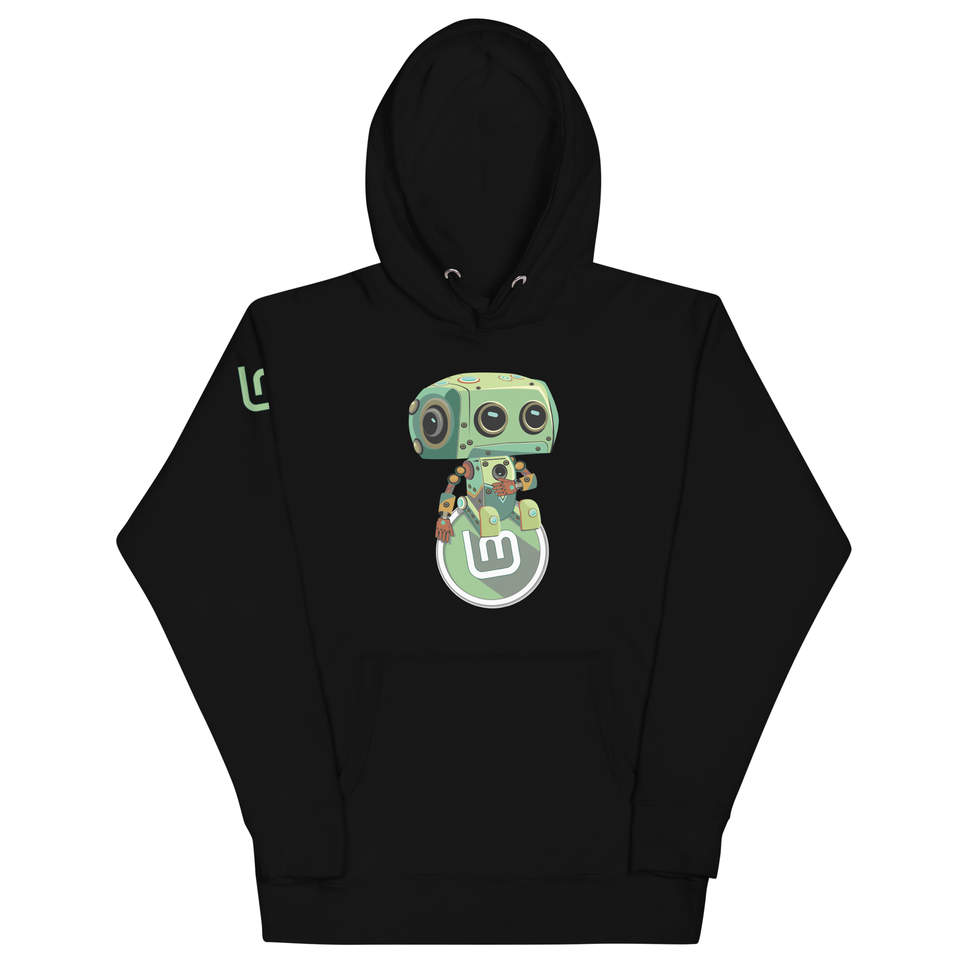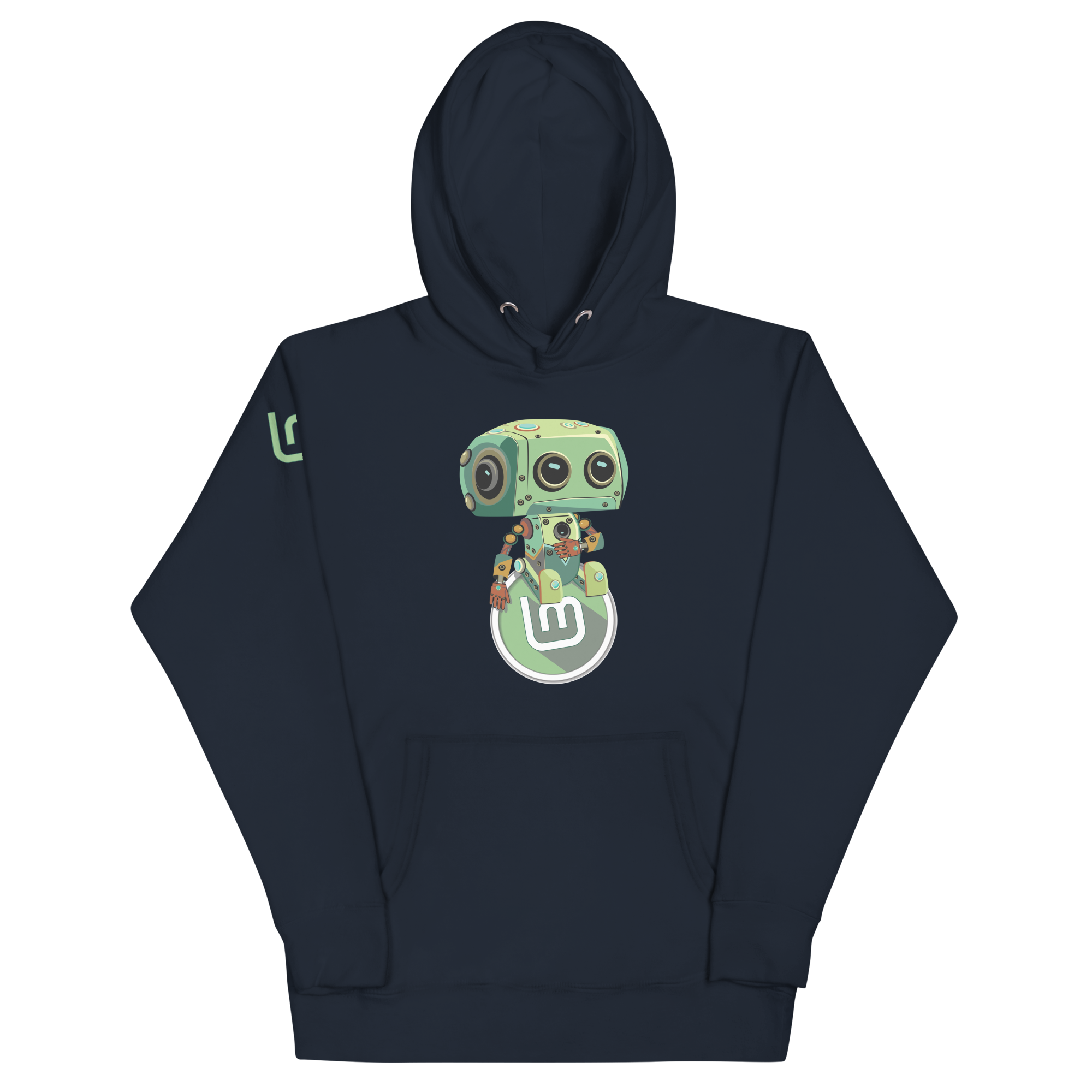 Linux Mint Robot print hoodie, with small Linux Mint emblem on the right arm.