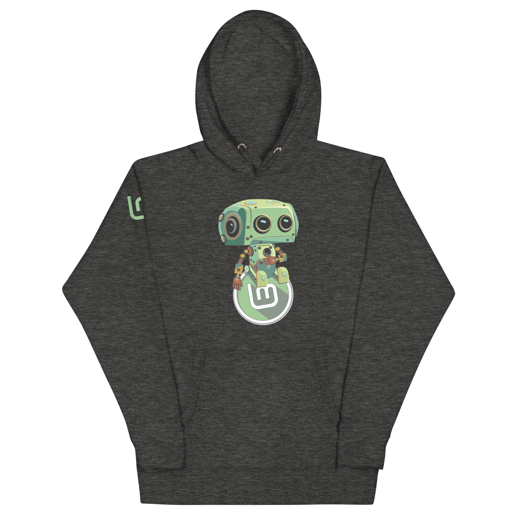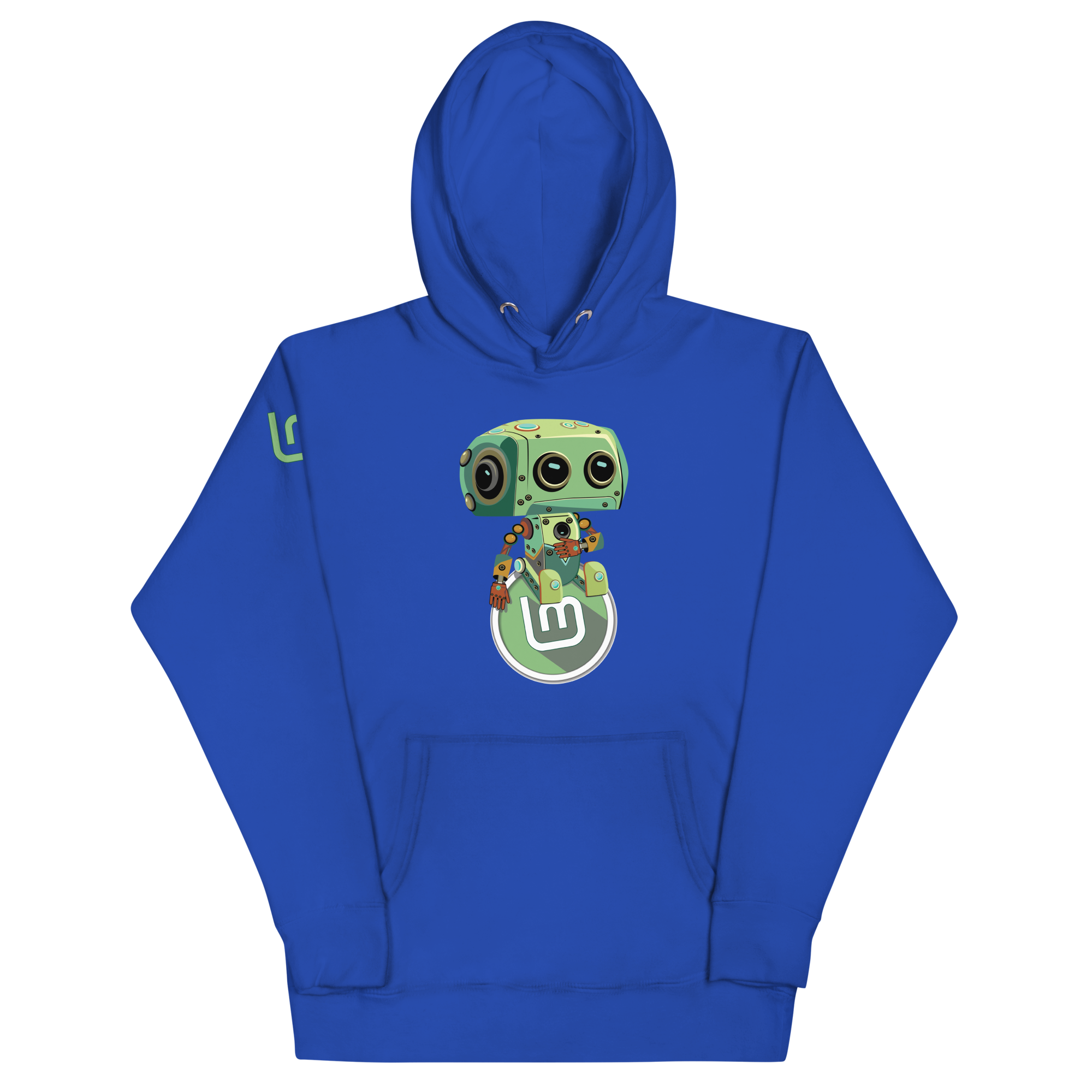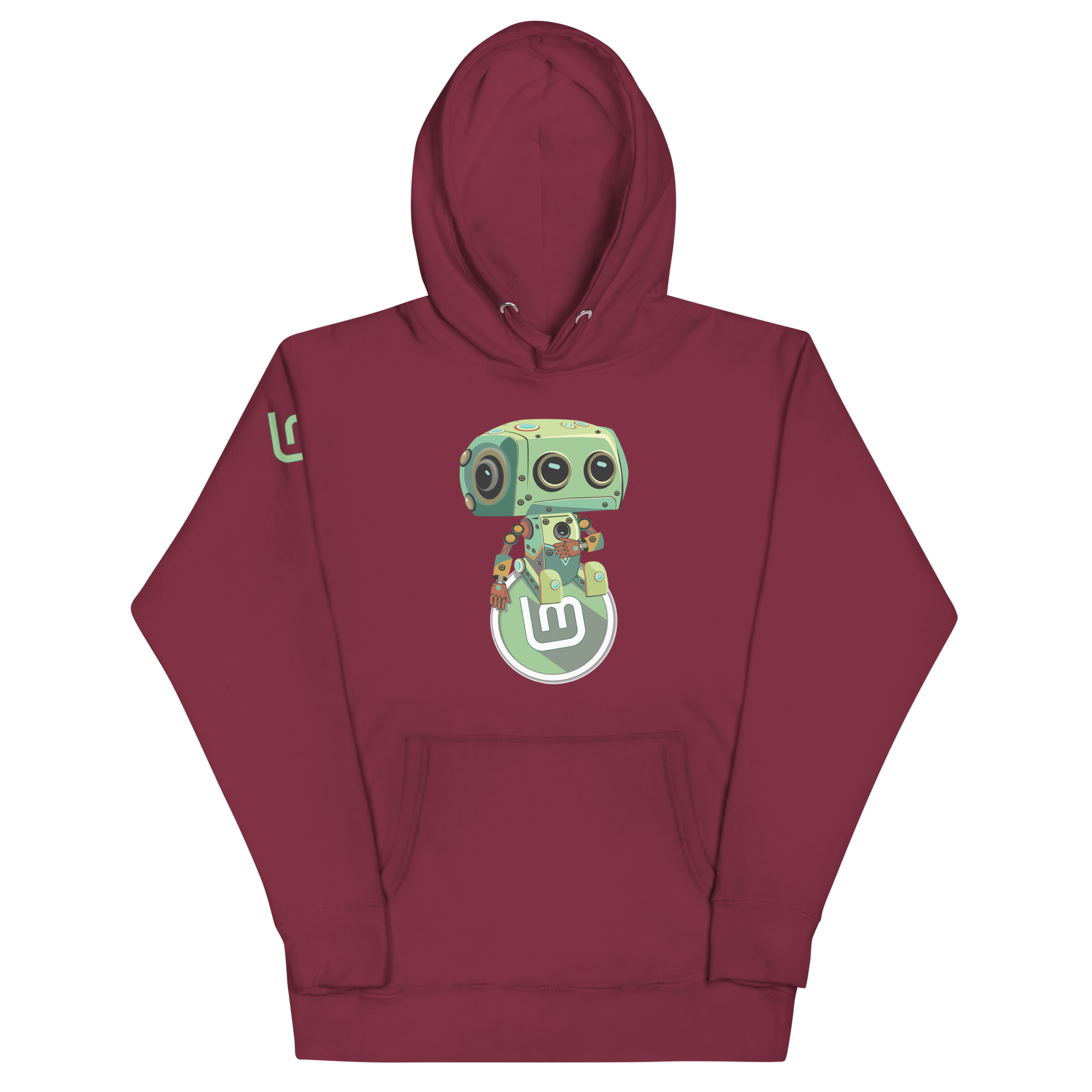 Linux Mint Robot print hoodie, with small Linux Mint emblem on the right arm.