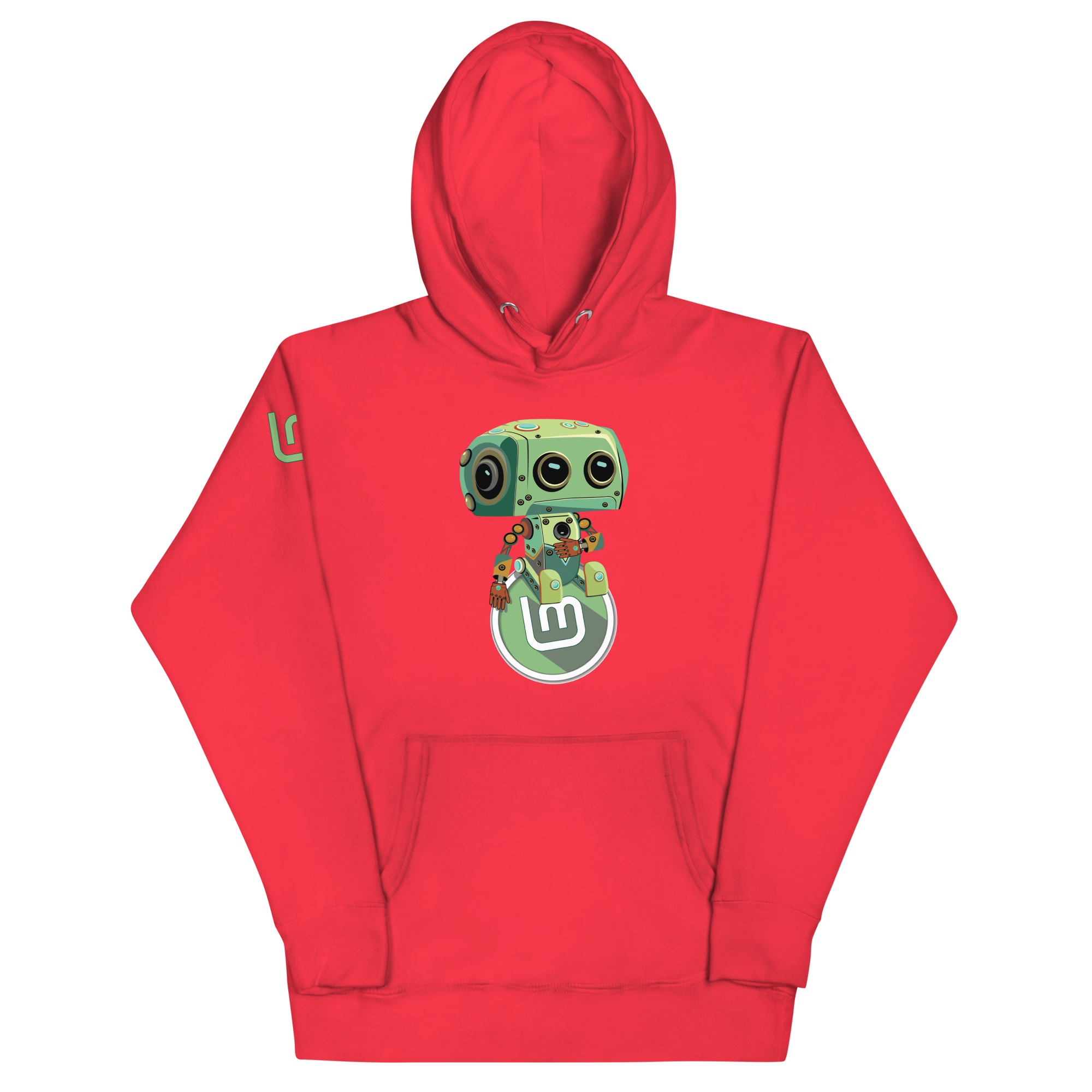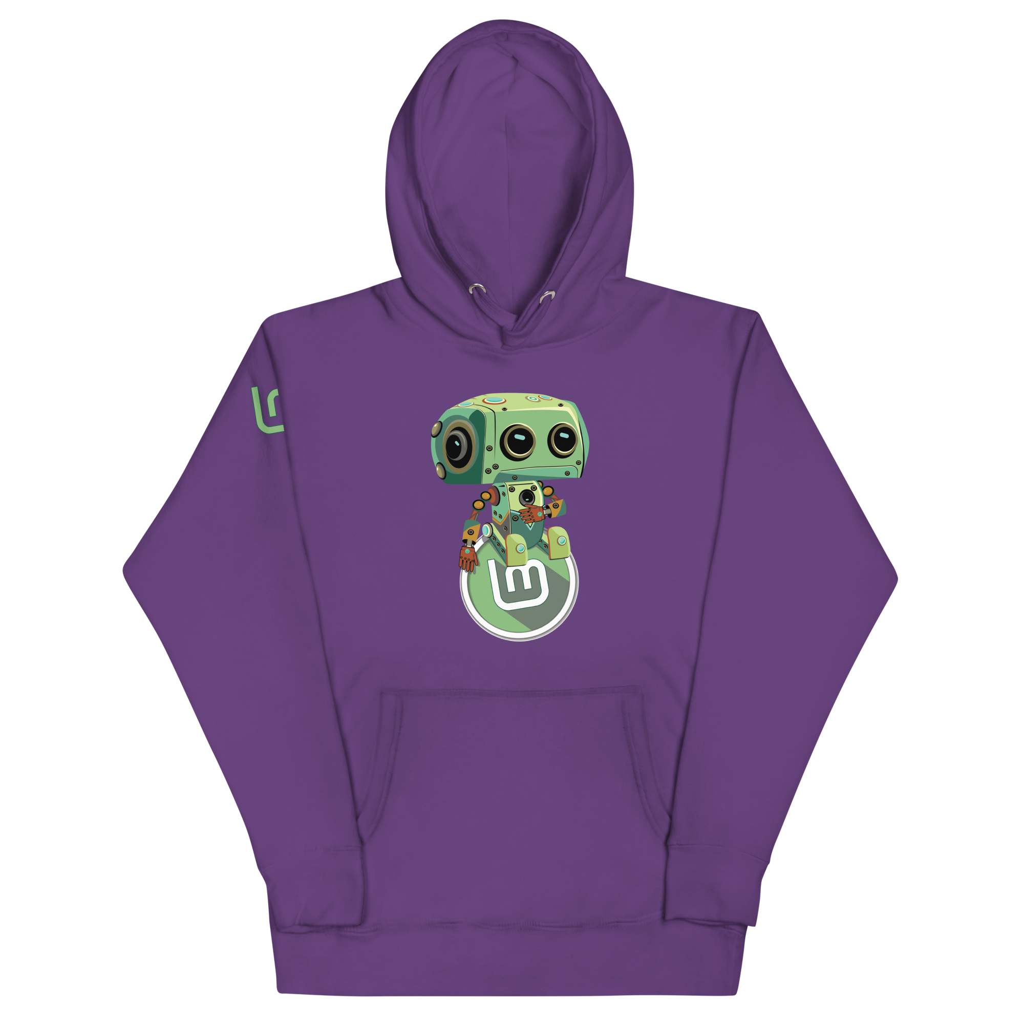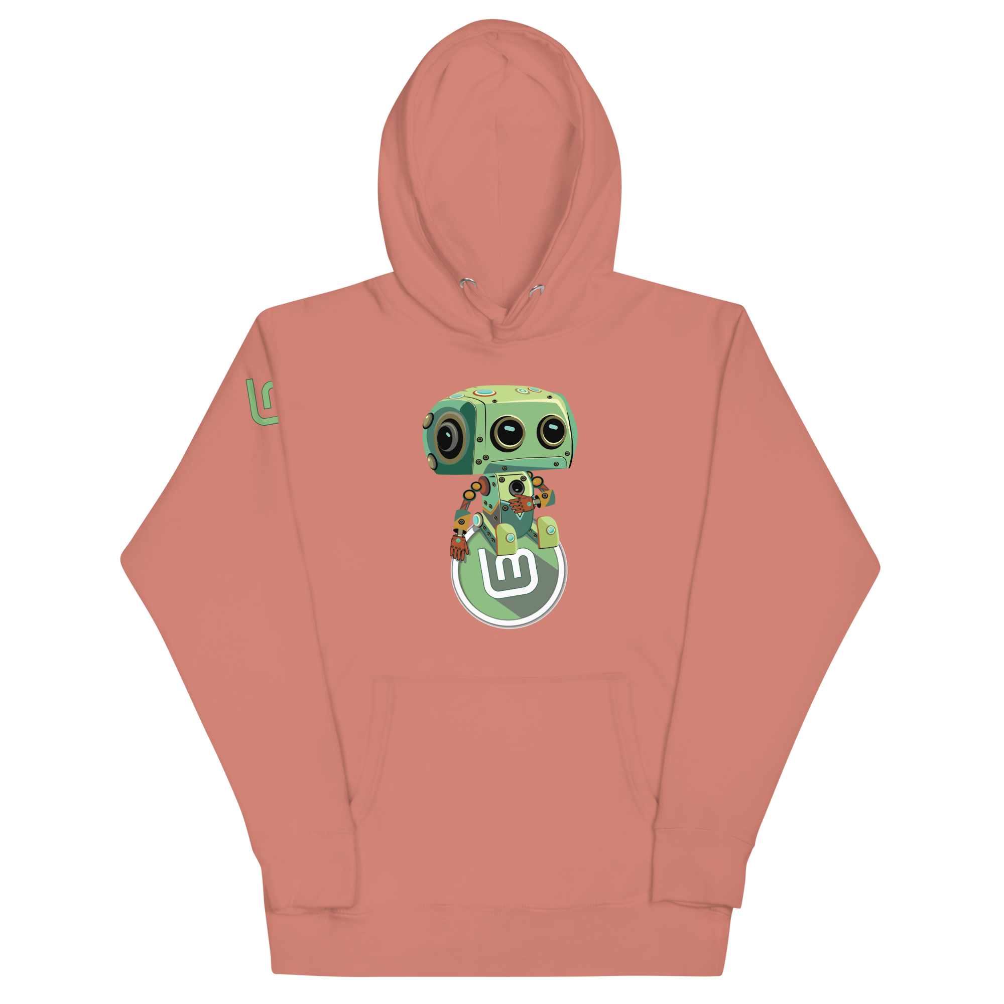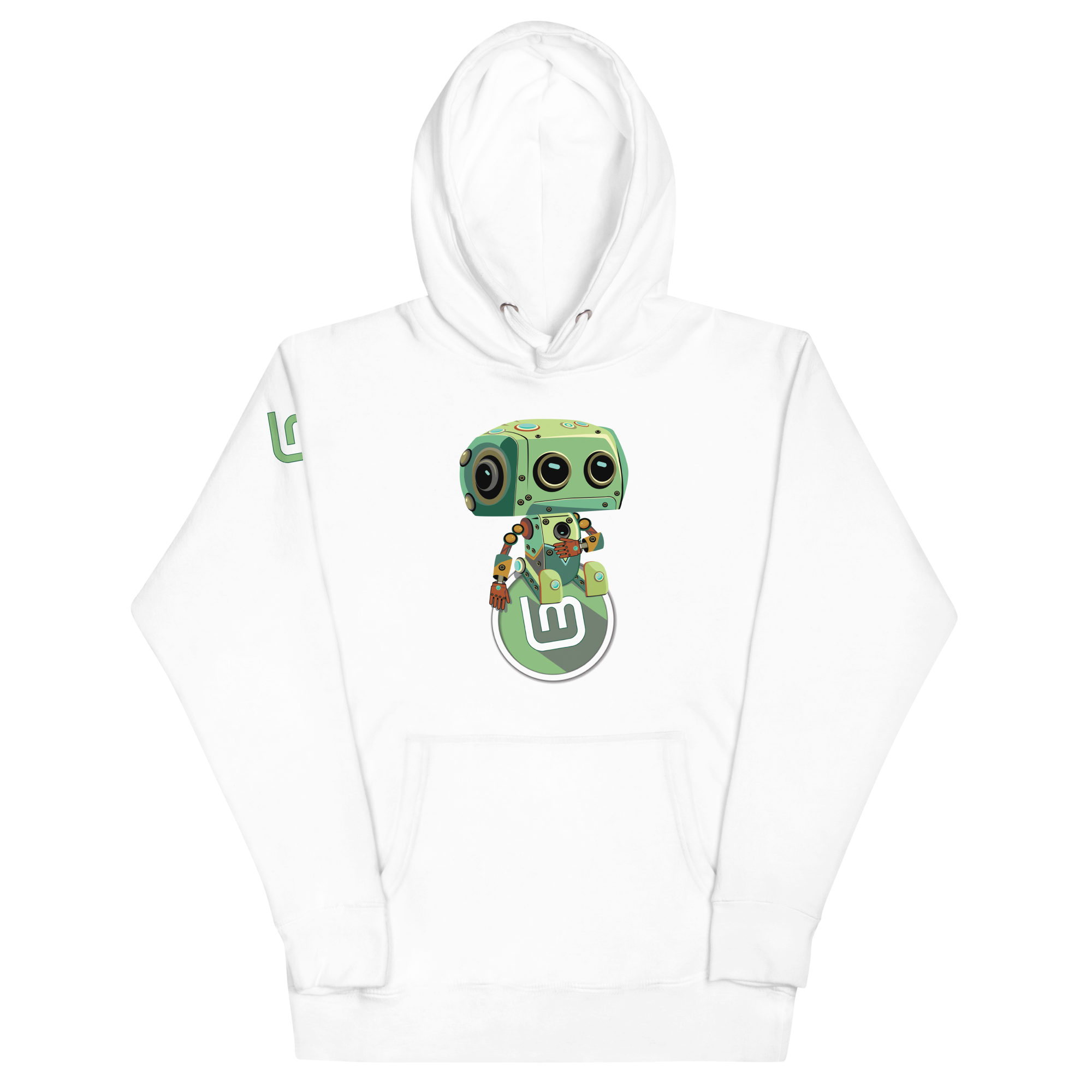 Linux Mint Robot print hoodie, with small Linux Mint emblem on the right arm.